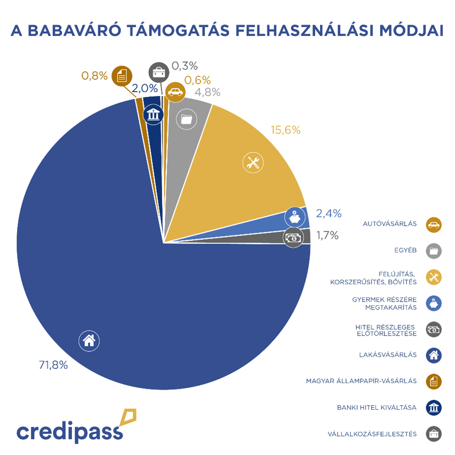 Az elmúlt évek nagy slágere, a Babaváró támogatás 2024 év végéig minden változtatás nélkül, tovább igényelhető a gyermeket tervező házaspárok számára. A maximum 20 éves futamidőre szóló, legfeljebb 10 millió forint összegben kérhető kamatmentes kölcsön verhetetlen előnye, hogy bármire felhasználható és nem szükséges hozzá ingatlanfedezet. A Credipass 2022-es adatai alapján az ügyfelek élnek is a szabadság adta lehetőséggel, volt, aki autóvásárlásra, mások utazásra költötték a kapott összeget, ugyanakkor a 2022-es év során a pénzügyi közvetítő cég által közvetített támogatásokat az igénylők legnagyobb arányban, 87,4%-ban ingatlancélra fordították. A hitelfelvevők kisebb része, 15,6%-a ingatlanfelújításra, bővítésre, korszerűsítésre költötte a kapott támogatást, míg 71,8%-uk otthonteremtési céllal folyamodott a kölcsönért. A harmadik legnépszerűbb az egyéb kategória volt, az igénylők 4,8%-a nem nevezte meg pontosan, hogy mire szánja a szabadon felhasználható összeget. A Credipass közreműködését kérő hitelfelvevők 95%-a a maximális összegre nyújtotta be kérelmét a tavalyi év során.